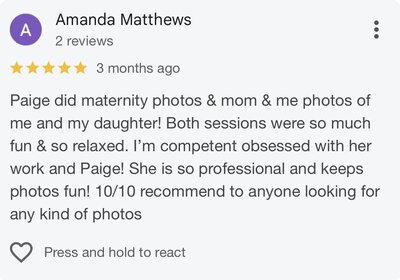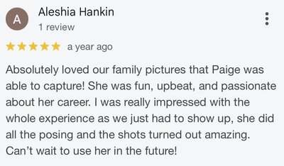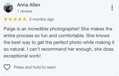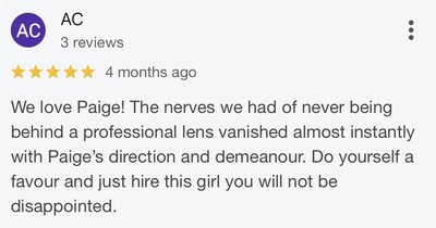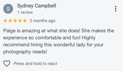 Me and my fiance had an absolute blast taking them! Paige made us feel so comfortable and I don't think we stopped laughing the entire time. Highly recommend her!”