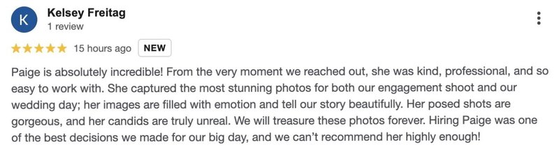 She was an absolute breeze to work with. Her communication and attention to detail were unbelievable. Professional, yet fun. Our photos could not have turned out any better, she was able to capture moments that I will forever cherish. All the small details and all the large family photos are exactly what I dreamt of. Paige is such a talented photographer, I would recommend her to absolutely anyone”